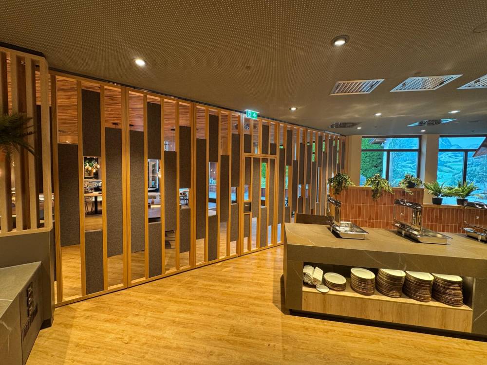 Maßgeschneiderte mobile Trennwände für das Buffetrestaurant Market Station der US Army in Garmisch-Partenkirchen.